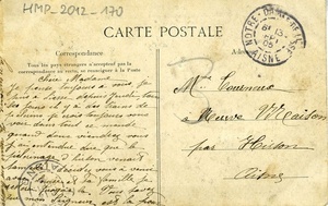 Karte im Querformat; Vorderseite: Gottesdienst im Freien. Die Bildüberschrift lautet: "25. Notre-Dame de Liesse / Messe dans la Cour du Séminaire un jour de Pèlerinage". Grußtext endet erst auf Vorderseite; Rückseite: Adressat: "Mme Courneuse (??) Aisne", Text: "Chère Madame / Je pense toujours à vous, je suis à Liesse depuis Jeudi, tous les jours il y a des trains de pèlerins, je crois toujours vous voir dans tout ce monde quand donc viendrez vous j’ai entendue dire que le pèlerinage d’Hirson venait samedi. décidez vous à venir avec Louise et sa famille je resterais (...) la. Vous savez que mon Seigneur est la pour (...) Mes meilleurs amitiés et compliments à (...)." Übersetzung: "Liebe Frau Ich denke immer an Sie, ich bin seit Donnerstag in Liesse, jeden Tag sind hier Züge von Pilgern, ich denke immer, Sie in der Menge zu sehen. Also kommen Sie? Ich habe gehört, dass die Pilgerfahrt von Hirson am Samstag kommt. Gedenken Sie mit Louise und ihrer Familie zu kommen? Ich bliebe (...) hier (?). Sie wissen, dass mein Herr dort ist um (...). Meine besten Grüße (...)."