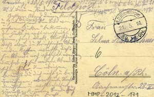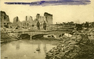 Karte im Querformat; Vorderseite: Soldaten auf einer Brücke. Im Hintergrund ist eine zerstörte Ortschaft zu sehen. Die Bildüberschrift lautet: "Fresnes in der Woevre Ebene".; Rückseite: Adressat: "Frau Selma Kantlehner Cöln am Rhein Aachenerstraße 28 II", Poststempel vom 21. Mai 1916, Text: "Samstag, d.20.5.1916./ M.L. Frau u. Kindern!/ Gestern Abend deine Karte/ u. Zeitung von Donnerstag mit dem Bild von/ uniformierten "Dicken" bekommen,/ der guckte ja recht verschmitzt,/ drum, herzl. Dank. Mir scheint,/ dass wenn du Briefsachen Abends/ in den Kasten wirfst, daß/ sie Abend noch abgeholt werden,/ dann hab ich sie andern Abends/ schon hier. Zur übrigen/ brauchts du dich nicht zu be-/ unruhigen, war heute Nacht/ draußen u. wohlbehalten/ zurückgekommen. Sende Euch/ herzl. Grüße Ernst."