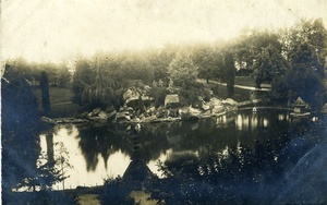 Karte im Querformat; Vorderseite: Foto von Soldaten, die auf einem Felsen an einem See posieren; Rückseite: handschriftlich vermerkt: "Stadt-Garten Valenciennes".