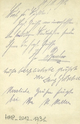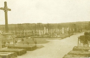 Karte im Querformat; Vorderseite: Foto eines Soldatenfriedhofes; Rückseite: Grußtext