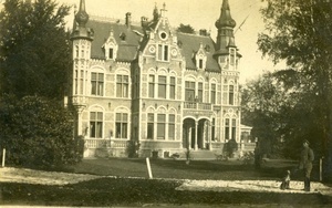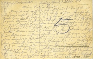 Karte im Querformat; Vorderseite: Foto einer prächtigen Villa; Rückseite: Text: "Schloß Koeknihöck- Sonntag Abend, d. 21.Okt.1917./ Mein Lieb u. Kinder!/ Soweit noch wohl auf, hoffentlich bei dir, hast mir/ allerdings anscheinend die ganze Woche wieder nicht geschrieben./ Heute ging ein Packetchen an dich ab mit versch. Kleinigkeiten/ so zwei kleine Packetchen Tabak, 3 (...) Seife a 2 M 103/ ein paar Läppchen Leder unter Hausschläppchen aus Stoff/ für Hänschen od. Liesbeth, verwahrst es am besten bis ich/ zu Euch komme, auch die übrigen Kleinigkeiten. Kannst/ mir außerdem auch mal schreiben, ob du nicht gerne irgend-/ etwas mitgebracht hast, falls ich es hier noch irgendwo kaufen/ kann, vielleicht eine warme Unterhose oder ein Umschlagtuch/ für dich u. was dieselben draußen bei Euch wohl ungefähr/ kosten jetzt. Im Garten dieses umstehenden Schlößchens liegen/ wir in Baracken. Im Vordergrund des Bildes siehst du einen/ Teil eines aus rotem Laub markierten roten Kreuzes (...)/ von weißen Backsteinen auf einer Wiese." Am linken Rand: "Herzliche Grüße/ auf frohes Wiedersehen Euer Vater Ernst"