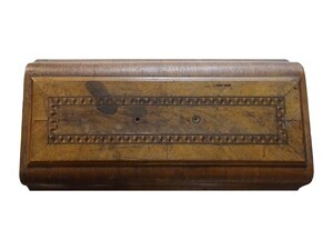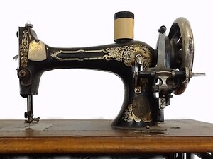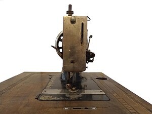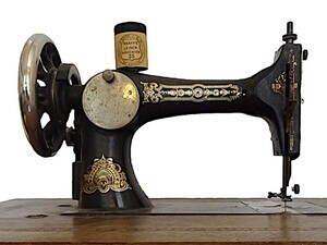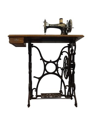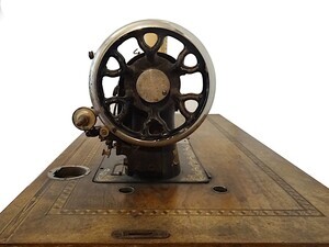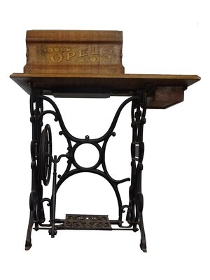 Nähmaschine Typ Opel B von 1907 mit mechanischem Antrieb der Marke "Opel" mit gusseisernem Untergestell, intarsiertem Kasten und Arbeitstisch; schwarz lackierte (gespritzte) Maschine mit Goldlackverzierungen. Die gusseisernen Gestelle und Standfüße für die Maschinen bezog Opel von der in Mainz ansässigen Firma Julius Römheld Eisengießerei und Stahlbau.