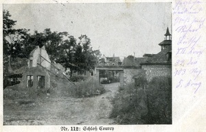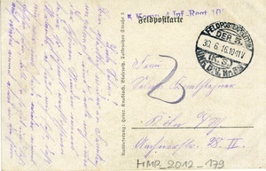 Karte im Querformat; Vorderseite: Foto des zerstörten "Schloß Courch". Der Grußtext geht weiter: "herzlichen / Dank und / Gruß sendet/ Richard/ Lutsch / XII (...)/ 32. Div./ 103.Reg./ 5. Komp."; Rückseite: Adressat: "Frau / Selma Kantlehner / Köln a.Rh. / Aachenerstr. 28.II.", Poststempel vom 30. März 1916, handschriftlicher Text: "Liebe Selma! / Bin glücklich wieder in Frankreich/ angelangt, und denke noch immer/ der schönen Stunden meines leider so schnell verflossenen / Urlaubs, es freut mich sehr, dass/ auch wir uns beide wieder einmal/ gesehen haben, bitte sei so gut und lass/ auch wieder einmal etwas von dir hören" (Grußtext weiter auf der Vorderseite)