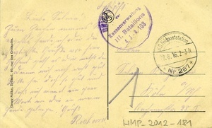 Karte im Querformat; Vorderseite: Foto des "Denkmals der Belagerung von Saint-Quentin (1557)" in besagter Stadt. Absender: "Abs/ Rich. Lutsch/ .Komp./ 103. Reg./ Div. Frankr./ Feldpost"; Rückseite: Adressat: "Frau/ Selma Kantlehner/ Köln a.Rh./ Aachenerstr. 28.II.", Poststempel vom 22. August 1916, handschriftlicher Text: "Liebe Selma!/ Zum Zeichen meines (...)/ (...) sende ich dir die/ herzlichsten Grüße von hier/ Hoffend (...) es dir nebst den/ deinen auch noch recht gut/ Bitte sei doch so gut und/ laß auch einmal ein paar/ Worte von dir in meine/ Hände gelangen. Gruß/ Richard"
