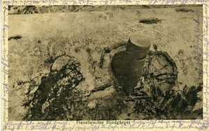 Karte im Querformat; Vorderseite: Der Grußtext geht weiter und umrahmt das Bild einer Bombe. Die Bildunterschrift lautet: "Französischer Blindgänger". Der weiter Grußtext: "bald besser gehen, dann bekommst du auch noch/ unser Fleißkärtchen, u. wenn ich bei euch zu Hause wäre, würde ich dir/ beim lernen auch helfen. Nun seid mir / für heute recht herzl. gegrüßt von eurem Vater/ Auch du l. Mutter sei herzl. gegrüßt u. lese du den Kindern diese Karte erst/ mal vor. Gruß Vater"; Rückseite: Adressat: "Hannchen und Ernst Kantlehner Cöln am Rhein Aachenerstraße 28 II", Poststempel vom 10. Oktober 1916, Handschriftlicher Text: "Montag Abend, d. 9.10.1916/Liebe Hannchen!/ Es freut mich/ dass mir die Mutter schrieb,/ dass es mit dir jetzt wohl/ besser geht, hoffentlich ists / auch wahr u. bleibst auch / weiter so , damit würdest/ du mir noch viel mehr Freude/ bereiten, ich bete auch weiter/ für dich. Und du l. Ernst, (...)/ dir freut es mich auch recht,/ dass du dir soviel Mühe gibst/ u. in der Schule gut aufpasst/ wenn es auch mit dem rechnen/ u. lesen noch nicht so geht,/ dass ist nicht schlimm, lerne mir/ weiter recht fleißig, dann wirds"