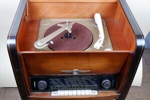 Die Musiktruhe „Rheinland 2054“ ist ein Standgerät auf Rollen gelagert. Die Truhe ist eine Kombination von Radio und Plattenspieler. Das Holz ist dunkel furniert und hoch Glanz lackiert. Nachdem öffnen des Deckels zeigt sich der Plattenspieler. Es ist ein Dual Einbaugerät Typ 1002 F. Ein 10er Wechsler mit den Geschwindigkeiten 33, 45, 78 upM. Das Radio von Loewe Opta verfügt über 7 elfenbeinfarbenen Drucktasten. Neben den Standard Wellenbereichen MW/LW/KW und UKW werden über sie noch der Plattenspieler, die Ferritantenne und der Ausschalter bedient. Große Drehregler gibt es für die Sendereinstellung, Laut/Leise und für das Einstellen der Klangfarben. Beim Öffnen der rechten, unteren Tür fanden wir noch, in einem Plattenständer, alte Schellackplatten. Ob dieser Ständer im Original dahin gehört, wissen wir nicht. Eine Schellackplatte der "Deutschen Grammophon AG" trägt einen Aufkleber : Musikhaus Merkur, Köln. Jakob Wagner, Ehrenstrasse 20 (s. Bild)