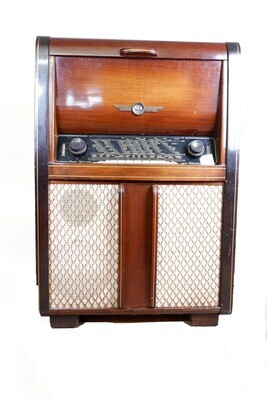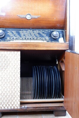 Die Musiktruhe „Rheinland 2054“ ist ein Standgerät auf Rollen gelagert. Die Truhe ist eine Kombination von Radio und Plattenspieler. Das Holz ist dunkel furniert und hoch Glanz lackiert. Nachdem öffnen des Deckels zeigt sich der Plattenspieler. Es ist ein Dual Einbaugerät Typ 1002 F. Ein 10er Wechsler mit den Geschwindigkeiten 33, 45, 78 upM. Das Radio von Loewe Opta verfügt über 7 elfenbeinfarbenen Drucktasten. Neben den Standard Wellenbereichen MW/LW/KW und UKW werden über sie noch der Plattenspieler, die Ferritantenne und der Ausschalter bedient. Große Drehregler gibt es für die Sendereinstellung, Laut/Leise und für das Einstellen der Klangfarben. Beim Öffnen der rechten, unteren Tür fanden wir noch, in einem Plattenständer, alte Schellackplatten. Ob dieser Ständer im Original dahin gehört, wissen wir nicht. Eine Schellackplatte der "Deutschen Grammophon AG" trägt einen Aufkleber : Musikhaus Merkur, Köln. Jakob Wagner, Ehrenstrasse 20 (s. Bild)