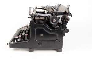 Die Mercedes-Bureau-Maschinen G.m.b.H wurde 1906 in Berlin gegründet. Der Markenname Mercedes, von den Daimler-Motorenwerken erworbenen. 1908 siedelte sich das Unternehmen in Mehlis/Thüringen an, wo auch die Produktion von Schreib- und Rechenmaschinen aufgenommen wurde. Nach dem 2. Weltkrieg wurde ging das Unternehmen in dem VEB Cellatron Büromaschinenwerk Zella-Mehlis auf. 1990 wurde der Betrieb aufgelöst; alle Gebäude am Standort des ehemaligen Mercedes-Werkes wurden abgerissen. Unser Objekt zählt mit 14,8 Kg. zu den schweren Büromaschinen. An Hand der Serien Nummer 542 844 konnten wir das Modell „ Mercedes 6 Express“ und das Herstellungsjahr, 1940/41, ermitteln. Seltsamer Weise gibt es auf der Unterseite eine zweite Nummer # 1 75 22 die wir aber nicht zuordnen konnten. Die Schreibmaschine verfügt über eine Wagenumschaltung, Wagnergetriebe, 2 Farbenband mit Umschaltung, Zeilenschaltung, Randsteller und einer kleinen Kurbel an der Rückseite mit der das Farbband zurück gespult wurde. An der Vorderseite gibt es eine verschließbare Klappe, hinter der sich der Typenkorb befindet. Somit sind die Typen einfach zu reinigen. Auf der Rückseite ist ein goldfarbene Aufdruck: „Mercedes Büromaschinenwerke AG Zella Mehlis in Thüringen“ angebracht. Seitlich wurde ein Metallschild angeschraubt mit der Werbung des Verkäufers: „Fa. Petry Koblenz, Tel 609“