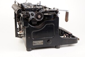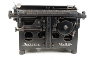 Die Mercedes-Bureau-Maschinen G.m.b.H wurde 1906 in Berlin gegründet. Der Markenname Mercedes, von den Daimler-Motorenwerken erworbenen. 1908 siedelte sich das Unternehmen in Mehlis/Thüringen an, wo auch die Produktion von Schreib- und Rechenmaschinen aufgenommen wurde. Nach dem 2. Weltkrieg wurde ging das Unternehmen in dem VEB Cellatron Büromaschinenwerk Zella-Mehlis auf. 1990 wurde der Betrieb aufgelöst; alle Gebäude am Standort des ehemaligen Mercedes-Werkes wurden abgerissen. Unser Objekt zählt mit 14,8 Kg. zu den schweren Büromaschinen. An Hand der Serien Nummer 542 844 konnten wir das Modell „ Mercedes 6 Express“ und das Herstellungsjahr, 1940/41, ermitteln. Seltsamer Weise gibt es auf der Unterseite eine zweite Nummer # 1 75 22 die wir aber nicht zuordnen konnten. Die Schreibmaschine verfügt über eine Wagenumschaltung, Wagnergetriebe, 2 Farbenband mit Umschaltung, Zeilenschaltung, Randsteller und einer kleinen Kurbel an der Rückseite mit der das Farbband zurück gespult wurde. An der Vorderseite gibt es eine verschließbare Klappe, hinter der sich der Typenkorb befindet. Somit sind die Typen einfach zu reinigen. Auf der Rückseite ist ein goldfarbene Aufdruck: „Mercedes Büromaschinenwerke AG Zella Mehlis in Thüringen“ angebracht. Seitlich wurde ein Metallschild angeschraubt mit der Werbung des Verkäufers: „Fa. Petry Koblenz, Tel 609“