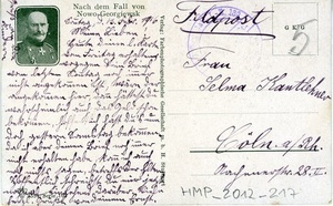 Karte im Querformat; Vorderseite: Abbildung "Nach dem Fall von Nowo Georgiewsk". Die nächtliche Szene zeigt im rechten Vordergrund eine Gruppe Soldaten um ein Lagerfeuer sitzend, im linken Bildteil marschieren weiter Soldaten neben einem großen Felsen vorbei. Im Hintergrund ist eine Ortschaft zu erkennen, die unter Beschuss steht; Rückseite: Adressat: "Frau /Selma Kantlehner / Cöln a.Rh./ Aachenerstr. 28.II.", handschriftlicher Text: "Sonntag, d. 13. Febr. 1916/ Meine Lieben!/ Heute deine l. Karte/ vom Freitag erhalten/ wogegen dein Brief/ vom letzten Sonntag noch immer/ nicht angekommen ist, wäre der/ angekommen hier, dann hättest du/ wahrscheinlich auch das Geld schon/ bekommen, hoffentlich hast du’s nun / doch gestern Samstag bekommen./ Da ich aber deinen Brief noch immer / nicht erhalten habe, kann ich auch/ noch nichts sagen, betreffs der Eltern./ Hoffentlich schreibst du mir jetzt/ nochmal eingehend darüber. Viele herzl. Grüße von deinem Ernst." In der oberen linken Ecke steht: "Grüße an die Kindern."