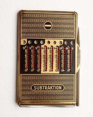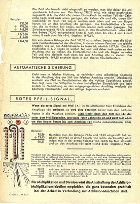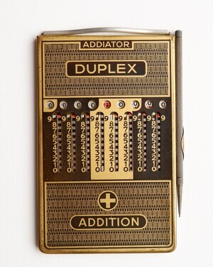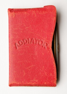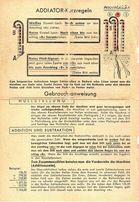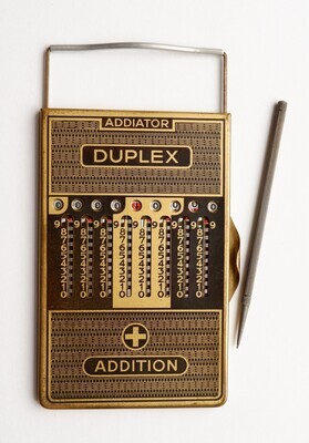 Rechenmaschinen waren für Otto Normalverbraucher lange unerschwinglich. Erst als Carl Kübler aus Berlin, 1920 einen einfachen, doppelseitigen Rechner entwickelte, stand ein Rechengerät für die breite Masse zur Verfügung. Der Addiator ist der mit 5.5 Mio. produzierten Exemplaren weltweit verbreitetste und erfolgreichste „Zahlenschieber“ Unser Addiator – Duplex wurde um 1930 hergestellt. Er hat eine messingfarbene Optik und steckt in einer roten Lederhülle mit eingeprägtem Namenszug „ADDIATOR“ Mit ihm lassen sich auch längere Zahlenkolonnen in einem Vorgang addieren bzw. subtrahieren. Mittels einem metallenem Stift, werden die Zahlenwerte + auf der Vorderseite und – auf der Rückseite eingegeben. Eine genaue Beschreibung sind unter „Bilder“ eingefügt.