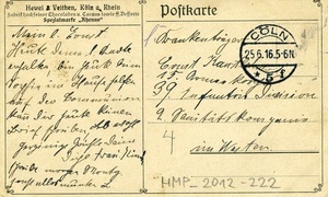 Karte im Querformat; Vorderseite: Man sieht wie im Auto sitzende Soldaten bei Dämmerung von feindlichen Soldaten überrascht werden. Bilduntertitel: "Gefährliche Fahrt in Feindesland" Über das i von "Feindesland" ist handschriftlich der i-Punkt durch ein Herz ersetzt worden; Rückseite: Adressat: "Krankenträger Ernst Kantlehner 15. Armeekorps 39. Infanterie Division 2. Sanitärkompanie im Westen", Poststempel vom 25. Juni 1916, handschriftlicher Text: "Mein l. Ernst./ Heute deine l. Karte/ erhalten, bin heute beim/ Sophie im Hause helfen/ auf der Communion/ Kann dir heute keinen/ Brief schreiben, Leb Wohl/ herzinige (sic.) Grüße deine/ dich l. Frau Kinder/ Schreibe morgen Montg (sic.)/ Sonst alles munter L."
