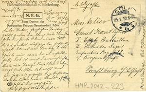Karte im Querformat; Vorderseite: Zeichnung des Generals v. Hindenburg; Rückseite: Adressat: "Musketier Ernst Kantlehner I. Ersatz Battaillon II. Rekrutendepot Infantrie Reg.139 4. (...) Straßburg i/ Elsaß", Poststempel vom 31. Januar 1916, handschriftlicher Text: "Lieber Vater, herzlichen Sontags- (sic.)/ gruß senden dir deine Frau. Kinder/ Habe dir heute Abend ein / Liebespacket (sic.) aufgegeben. hoffentlich/ erhälst du es am Sontag, bitte/ schreibe mir, wenn du es erhalten/ hast, das ich mich darnach (sic.) richten/ kann wie lange diesselben unter-/ wegs sind.Nun leb wohl und/ sei herzinnig gegerüßt und geküsst von/ deinen lieben Frau u. Kinder (sic.), hoffentlich/ geht es dir auch gut./ Auf frohes Wiedersehen." Oberhalb links: "Grüß vom/ (...), er ist/ wieder besser,/" Oberhalb rechts: "werd dir/ Sontg. einen/ Brief schrieben/" Oberhalb: "Bleib mir Gott befohlen d. Selma"