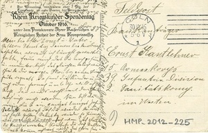 Karte im Querformat; Vorderseite: Foto einer Mutter mit ihrem Kind. Bildunterschrift:"Zum Besten der / Kriegskinderspende/ Deutscher Frauen/ Cecilie/ Kronprinzessin Grußtext endet auf der Vorderseite: "Der Ernst hat dir die (...) gekaufe (?), so läßt dich fragen ob du am/ (...) noch (...) hast, was hälst davon, sollst ihm bestimmt sagen wie es/ ist. (...) lassen dich grüßen./ Also morgen bekommst (?) du wieder einen langen Brief deine Frau/ nochmal (...)."; Rückseite: Adressat: "Krankenträger Ernst Kantlehner 15. Armeekorps 39. Infantrie Division 2. Sanitätskomp. im Westen", Poststempel vom 30. Oktober 1916, gedruckter Text: "Der Reinertrag, mind. aber 7 Pfg. der/ Einzelkarte ist zum Besten der Kriegskinder/ Rhein. Kriegskinder-Spendentag/ Oktober 1916,/ unter dem Protektorate Ihrer Kaiserlichen u./ Königlichen Hoheit der Frau Kronprinzessin", handschriftlicher Text: "Mein liebster Ernst u. Vater!/ Gestern Sonntag deinen lieben Brief/ erhalten worauf ich längst gewartet/ hatte, freue mich dass du noch gesund/ u. munter bist, dass gleiche auch wir/ schreibe dir morgen Montag einen Brief/ heute regnets da sind die Kinder um/ mich rum, hernach um 6 Uhr will ich zur/ Kirche, dann wirds wohl mit dem Schreiben/ auch nicht mehr werden. Nun bist du/ mein Lieb ein ganzes langes Jahr/ Soldat wärst doch du wieder bei uns/ ich hatte gestern Sonntag wieder so Heimweh/ was meinst du wohl nach wem ? Ich glaube/ du kannst es erraten. Könntest du doch bald in Urlaub kommen, ach was wird das schön sein/ mein Lieb." oben: "Leb wohl mein Lieb, u. (...) treuer/ Lieb gegrüßt u. (...) geküßt von/ deiner dich l. Frau u. Kinder!/ auf frohes Wiedersehen deine dich l. Selma."