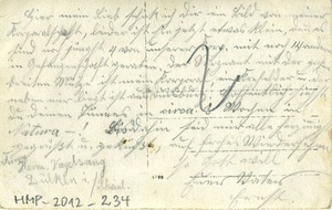 Karte im Querformat; Vorderseite: Foto einer Soldatentruppe, einer von ihnen ist mit einem Kreuz handschriftlich gekennzeichnet worden; Rückseite: Handschriftlicher Text: "Hier mein Lieb schick ich dir ein Bild von meiner/ Korporalschaft, leider ist sie jetzt etwas klein, denn es/ sind noch jüngst 4 von unserer Korp. mit noch 14 anderen/ in Gefangenschaft geraten. Der Sergeant mit der großen/ breiten Mütze ist mein Korporal, ein Krefelder u. der/ neben mir liegt ist aus Duisburg. Hoffentlich siehst/ du deinen Tünnes in circa 3 Wochen in/ Natura -! Bis dahin seid mir alle herzinnigst/ gegrüßt und geküßt, auf frohes Wiedersehen/ So Gott will/ Euer Vater/ Ernst"