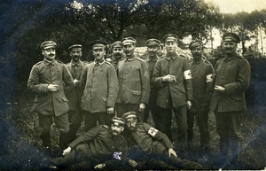 Karte im Querformat; Vorderseite: Foto einer Soldatentruppe, einer von ihnen ist mit einem Kreuz handschriftlich gekennzeichnet worden; Rückseite: Handschriftlicher Text: "Hier mein Lieb schick ich dir ein Bild von meiner/ Korporalschaft, leider ist sie jetzt etwas klein, denn es/ sind noch jüngst 4 von unserer Korp. mit noch 14 anderen/ in Gefangenschaft geraten. Der Sergeant mit der großen/ breiten Mütze ist mein Korporal, ein Krefelder u. der/ neben mir liegt ist aus Duisburg. Hoffentlich siehst/ du deinen Tünnes in circa 3 Wochen in/ Natura -! Bis dahin seid mir alle herzinnigst/ gegrüßt und geküßt, auf frohes Wiedersehen/ So Gott will/ Euer Vater/ Ernst"