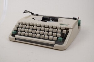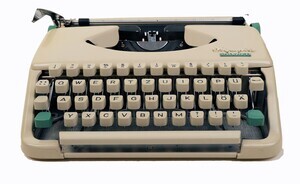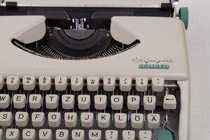 1930 erhielt die Europa Schreibmaschinen AG aus Erfurt den international geschützten Markennamen „Olympia“. Nach dem 2.Weltkrieg flohen Mitarbeiter des Erfurter Werkes samt Konstruktionsunterlagen in den Westen. In Roffhausen/Wilhelmshaven begannen sie ab 1946 wieder mit der Schreibmaschinen Produktion. Für das Wilhelmshavener Werk lautete die Firma ab 1950 Olympia Werke West GmbH und ab Juni 1954 erhielt das Unternehmen seine bekannte Firma Olympia Werke AG. Unser Objekt ist eine Olympia Splendid 33, die in einem hellgrauem Alugehäuse daher kommt. Ihre Robustheit und Zuverlässigkeit machte sie zu einer beliebten Maschine unter den Reportern. Gebaut wurde sie zwischen 1959 und 1968. Sie hat den Olympia typischen, weichen Anschlag. Die Maschine ist sehr gut erhalten und schreibt einwandfrei. Technisch handelt es sich um eine Typenhebelschreibmaschine mit Wagnergetriebe, Wagenschaltung, Zeilenschaltung, Rücktaste, Wagenfeststeller und deutscher Q W E R T Tastatur. Ein zwei Farbenband ist bei der Splendid 33 nicht vorgesehen.