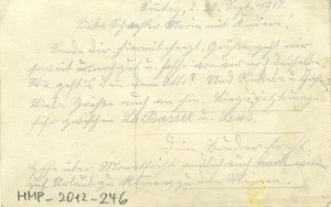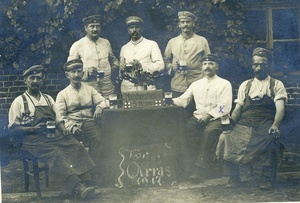 Karte im Querformat; Vorderseite: Foto von Soldaten mit Bierkrügen. Einer von ihnen ist handschriftlich mit einem Kreuz markiert; Rückseite: Handschriftlicher Text: "Sonntag, d. 30.Sept.1917./ Liebe Schwester Marie mit Kindern!/ Sende dir hiermit herzl. Grüße, geht mir/ soweit noch gut u. hoffe von dir noch dasselbe./ Wie geht’s denn dem Otto? Und Rukele u. Christian?/ Viele Grüße auch an sie . Liege jetzt unge-/ fähr zwischen La Bassel u. Lens./ Dein Bruder Ernst/ Hoffe über Monatsfrist endlich auch mal wieder/ auf Urlaub zu kommen zu den Meinen."