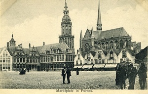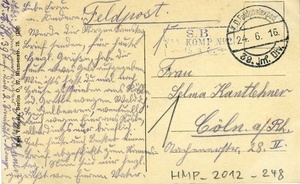 Karte im Querformat; Vorderseite: Foto eines Stadtplatzes. Bildunterschrift lautet: "Marktplatz in Furnes"; Rückseite: Adressat: "Frau Selma Kantlehner Cöln am Rhein Aachenerstraße 28 II", Poststempel vom 24. Juni 1916, handschriftlicher Text: "Liebe Frau/ u. Kinder!/ Werde dir morgen Samstag/ Brief senden, für heute/ herzl. Grüße, habe dir/ heute etwas Geld aufgegeben./ Wie ists hast du mal nach/ Hause geschrieben und Rüsle/ oder Gretle wegen Wald d.h./ Heidelbeeren eventuell/ auch wegen Eier aus Rüsle,/ allerdings nur brieflich./ Habe heute auch Becker einen/ Brief abgeschickt zum Namens-/ tag. Nun seid mir herzl./ gegrüßt von Eurem Vater."