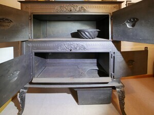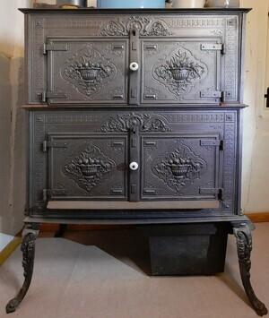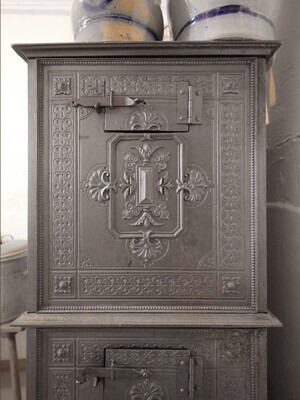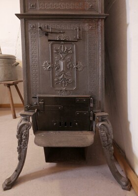 Zweistöckige Margaretenofen (der Name kommt vom Margeretendekor der ersten Öfen dieses Ofentyps). Es handelt sich bei diesem Ofentyp um einen kombinierten Kochherd und Heizofen. Er ist eine rechteckige Spezialform des Hopewell-Ofens. Margaretenöfen wurden etwa von 1860 bis 1900 gebaut. Unser Exemplar überliefert leider keinerlei Informationen zum Baujahr und zu Hersteller. Der Ofen wird unten an der rechten Schmalseite befeuert. Der Brennraum ist in den Ofen integriert und mit einem Türchen verschließbar. Die Regulierung des Luftzugs erfolgte durch einen Schieber, der leider verloren gegangen ist. Der Aschekasten hängt unten am Brennraum. Der Sammelbehälter für die Asche ist leider nicht mehr vorhanden. Zwischen Brennraum und Aschekasten befindet sich ein einfacher Rost. Unter und über den Böden der beiden Stockwerke befinden sich Kanäle für die heiße Abluft des Ofens. Im Boden des unteren Stockwerks befindet sich ein rundes Loch, durch das Tiegel in das Ofenfeuer gehängt werden konnten. Der Boden des unteren Stockwerks (der den Kochbereich vom Brennraum trennt) hat leider einen Riss, wodurch der Ofen derzeit wohl nicht benutzbar sein dürfte. Das untere Stockwerk diente typischerweise zum Kochen, das obere zum Warmhalten der Speisen. An beiden Seite sind an jeweils beiden Stockwerken kleine Klappen - wahrscheinlich zum Reinigen der Züge.