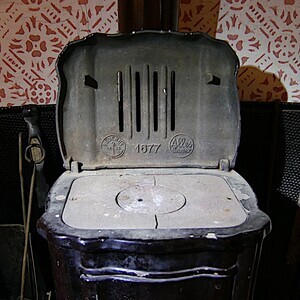 Buderus Allesbrenner 1677, Regulierofen irischer Bauart von der Firma Buderus in Wetzlar. Der Heizofen bietet auch die Möglichkeit zum Kochen. Außen dunkelbraun emailliert, Brennkammer mit Schamotte verkleidet. Reguliermöglichkeit an der Aschentür mittels Schieber. Doppelter Rost mit Rüttelrost zwischen Brenn- und Aschenkammer. Rechts unten am Ofen befindet sich ein Knopf, mit dem der Rost gerüttelt werden kann. Auf dem Ofen liegt ein nach hinten aufklappbarer "Deckel" durch dessen Ritzen die warme Luft nach oben entweichen kann. Klappt man diesen auf so wird wird eine Kochpaltte zugänglich, auf die man einen Topf oder auch ein Bügeleisen zum Aufwärmen stellen kann. Innerhalb dieser Platte ist eine kreisförmige, mit einem Deckel verschlossene Öffnung die dazu diente, einen Topf zum kochen der darin liegeneden Lebensmittel in den heissen Rauch zu hängen.
