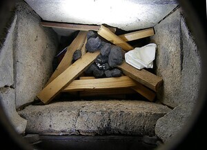 Buderus Allesbrenner 1677, Regulierofen irischer Bauart von der Firma Buderus in Wetzlar. Der Heizofen bietet auch die Möglichkeit zum Kochen. Außen dunkelbraun emailliert, Brennkammer mit Schamotte verkleidet. Reguliermöglichkeit an der Aschentür mittels Schieber. Doppelter Rost mit Rüttelrost zwischen Brenn- und Aschenkammer. Rechts unten am Ofen befindet sich ein Knopf, mit dem der Rost gerüttelt werden kann. Auf dem Ofen liegt ein nach hinten aufklappbarer "Deckel" durch dessen Ritzen die warme Luft nach oben entweichen kann. Klappt man diesen auf so wird wird eine Kochpaltte zugänglich, auf die man einen Topf oder auch ein Bügeleisen zum Aufwärmen stellen kann. Innerhalb dieser Platte ist eine kreisförmige, mit einem Deckel verschlossene Öffnung die dazu diente, einen Topf zum kochen der darin liegeneden Lebensmittel in den heissen Rauch zu hängen.