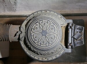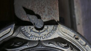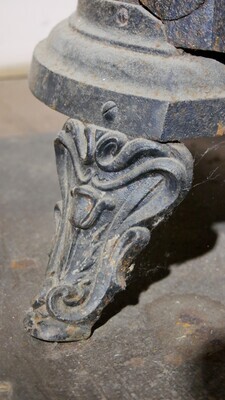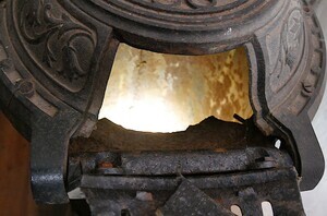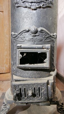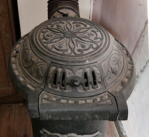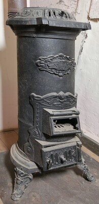 Dauerbrandofen bzw. Regulierfüllofen, auch zur Verfeuerung von Kohle geeignet. An der Rückseite beim Anschluss für den Schornstein Hebel zur Regulierung der Luftzufuhr. Klappe zum füllen mit Kohlen am Deckel. An der Frontseite Ornament mit Inschrift "N= 62" .Der Deckel zur Brennkammer fehlt (dort wäre wahrscheinlich der Name des Herstellers zu finden gewesen.). Ein doppelter Rost trennt die Brennkammer von der verzierten Ascheschublade. Der Ofen steht auf drei ebenfalls mit Jugendstilelementen verzierten Füße Der Durchmesser wurde an der breitesten Stelle gemessen.