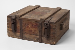 Munitionskiste für Granaten mit Brandzeichen OE, 1914-1918 Im Historischen Museum der Pfalz war vom 29.4.2014 bis 24.9.2017 die Ausstellung "1914 - 1918. Die Pfalz im Ersten Weltkrieg" zu sehen. Auf einen öffentlichen Aufruf hin meldeten sich zahlreiche Privatpersonen, ihre Objekte wurden in dieser Sammlung erfasst und z. T. auch in der Ausstellung gezeigt. Die Objekte befinden sich im Eigentum der Privatpersonen und sind nicht Teil der Sammlungen des Historischen Museums der Pfalz.