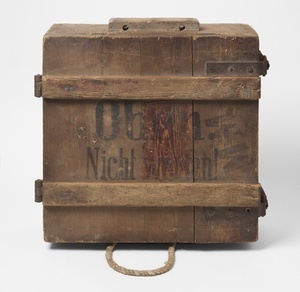 Munitionskiste für Granaten mit Brandzeichen OE, 1914-1918 Im Historischen Museum der Pfalz war vom 29.4.2014 bis 24.9.2017 die Ausstellung "1914 - 1918. Die Pfalz im Ersten Weltkrieg" zu sehen. Auf einen öffentlichen Aufruf hin meldeten sich zahlreiche Privatpersonen, ihre Objekte wurden in dieser Sammlung erfasst und z. T. auch in der Ausstellung gezeigt. Die Objekte befinden sich im Eigentum der Privatpersonen und sind nicht Teil der Sammlungen des Historischen Museums der Pfalz.
