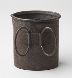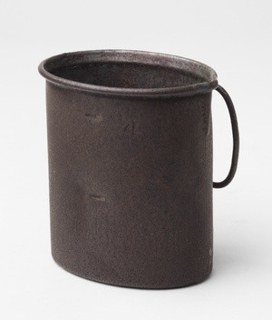 Feldflasche mit Trinkbecher; Feldflasche hergestellt bei (...) in Karlsruhe, 1914-1918; Trinkbecher hergestellt bei: Gebrüder Bing AG, Nürnberg, 1915 Im Historischen Museum der Pfalz war vom 29.4.2014 bis 24.9.2017 die Ausstellung "1914 - 1918. Die Pfalz im Ersten Weltkrieg" zu sehen. Auf einen öffentlichen Aufruf hin meldeten sich zahlreiche Privatpersonen, ihre Objekte wurden in dieser Sammlung erfasst und z. T. auch in der Ausstellung gezeigt. Die Objekte befinden sich im Eigentum der Privatpersonen und sind nicht Teil der Sammlungen des Historischen Museums der Pfalz.