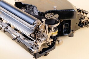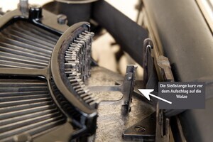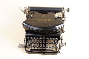 Vom total verdrecktem und angerosteten Dachbodenfund zur strahlenden Schönheit! ……. und das mit 111 Jahren! So alt ist unsere ADLER No. 7. Unser Modell trägt die Herstellungsnummer 57.204 was auf das Herstellungsjahr 1909 hinweist. Als wir sie vor Jahren erhielten, war sie in einem bedauernswerten Zustand. Es gibt es von diesen Maschinen nicht mehr sehr viele, weshalb wir uns zu einer Generalüberholung entschlossen haben. Heute erstrahlt unsere ADLER 7 wieder in ihrem früheren Glanz. Technisch gesehen handelt es sich um eine Stoßstangen-Schreibmaschine. Ein Prinzip, das sich nicht durchgesetzt hat. Ihre Schrifttypen sind an der Spitze einer Metallschiene angebracht, die beim kräftigen Druck auf die Tasten, gleich einem Pfeil, auf die Walze bzw. das Papier gestoßen wird. Bekannteste Vertreterin Ihrer Art war, wie auch unser Objekt, die ADLER 7. Schon um 1900 war sie im In- und Ausland hochbegehrt. Auch der damals hohe Preis –heute etwa 1500 € - änderte daran nichts. Der Hersteller, die „Adler Fahrradwerke, vorm. Heinrich Kleyer AG“, boten ihren Kunden, mit dieser Maschine, ein technisch brillanten Modell, absolut zuverlässig und robust. Auf der schwarzen Abdeckhaube prangt die Aufschrift „ADLER“ sowie „Adlerwerke vorm. Heinrich Kleyer Aktiengesellschaft Frankfurt a/M.“. Um den Ursprung als Fahrradwerke zu betonen, wurde über dieser Schrift ein goldfarbiger Adler mit einem Rad abgebildet. In der gleichen goldenen Schrift ist der vordere Rand des Deckels mit dem Namen der Vertriebsfirma „Gebr. Haack, Trier“ beschriftet.