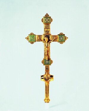 Kreuz aus reich verzierten, vergoldeten Messingplatten über Kern aus Zedernholz. Gekreuzigter auf der Vorderseite im Dreinageltypus. Platten mit Blattwerkranken auf den Kreuzarmen. Blattverzierte Emailplatten auf den Kreuzenden. Am Knauf die vier Evangelistensymbole in Rundbildern. Rückseite mit Filigranplatten mit bunten Glaspasten und Perlmuttverzierung. An den Kreuzenden Emailplättchen mit Passionsszenen. Offenbar wurde das Kreuz im 19. Jh. aus mittelalterlichen Bestandteilen und neu angefertigten Elementen neu montiert. Aufgrund der zahlreichen Überarbeitungen und Restaurierungen lassen sich nur schwer Aussagen über genaue Entstehungszeit und Herkunft treffen. Das Kreuz wurde 1925/30 und nochmals vor 1960 neu vergoldet. Clemens Jöckle ordnete die Ranken- und Emailplatten der Rückseite stilistisch in den Umkreis der Trierer Arbeiten um 1230 ein. Der Kruzifixus könnte kurz nach 1200 im Lütticher Raum entstanden sein.