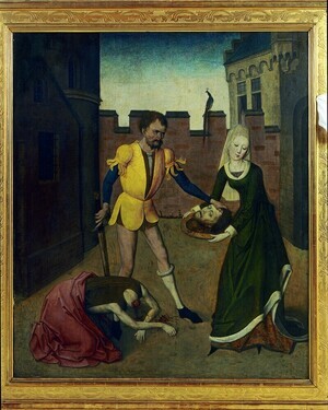 Doppelseitig bemalter Altarflügel vom Kölner Meister des Marienlebens. - 1) Urspr. Innenseite (Festtagsseite) mit der Verklärung Christi auf dem Berg Tabor; ungemusterter Goldgrund;: rechts und links von Christus die Büsten von Moses und Hesaias/Elias; unten am Berg drei Jünger, erstaunt und geblendet; Christus im Segensgestus; rechts hinten Ausblick in Landschaft 2) Ursprünglich Außenseite mit Enthauptung des Täufers; spätgotischer Palasthof vor blauem Himmel; links vorn Leiche des Johannes, dahinter der Henker, der mit der Linken der Salome die Schüssel mit dem Kopf reicht.