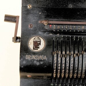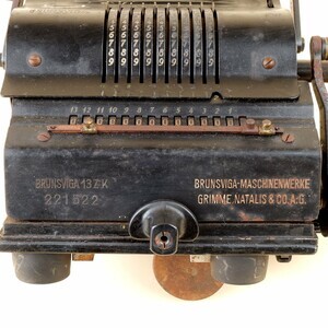 1871 wurde die Firma Grimme, Natalis & Co. (kurz: GNC) in Braunschweig gegründet. Die erste Rechenmaschine wurde im Juli 1892 unter dem Namen „Brunsviga“ für 150 Mark ausgeliefert und 1893 auf der Weltausstellung in Chicago, von Deutschland ausgestellt. Bis zum Firmenjubiläum 1952 wurden insgesamt etwa 260.000 Rechenmaschinen gebaut. Aus finanziellen Gründen erfolgte 1957 die Übernahme durch die Olympia-Werke, Wilhelmshaven. Auf Grund der technischen Weiterentwicklung, hin zur Transistortechnik, verloren die mechanischen Maschinen schnell an Wettbewerbsfähigkeit. Unsere Maschine wurde als Modell 13 ZK etwa 1947 mit der Seriennummer 221 522 in Braunschweig gebaut. Sie verfügt über eine Zehnerübertragung im Umdrehungszählwerk und eine Einzellöschung der drei Zählwerke. Über einen weiteren Hebel können gleichzeitig alle Zählwerke in die Null Stellung gebracht werden. Technisch handelt es sich um eine Sprossenradmaschine mit 10 x 8 x 13 Stellen (Einstellwerk/Zählwerk/Resultatwerk). Das Gehäuse ist dunkel lackiert und zeigt deutliche Spuren unsachgemäßer Behandlung. Auf der Vorderseite ist der Maschinentyp, die Produktionsnummer und der Hersteller eingestanzt. Ein aufgenietetes Metallplättchen zeigt das Firmenlogo, einen stilisierten Kopf mit mehreren Zahnrädchen. Leider hat die Maschine im Laufe ihres Daseins einen größeren (Sturz) Schaden erlitten, wodurch das Werk komplett blockiert ist. Die unsachgemäße Lagerung in der Zeit danach, sorgte für deutlichen Rostansatz.