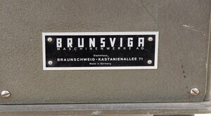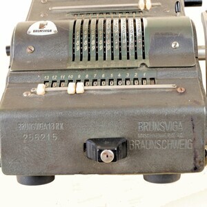 1871 wurde die Firma Grimme, Natalis & Co. (kurz: GNC) in Braunschweig gegründet. Die erste Rechenmaschine wurde im Juli 1892 unter dem Namen „Brunsviga“ für 150 Mark ausgeliefert und 1893 auf der Weltausstellung in Chicago von Deutschland ausgestellt. Bis zum Firmenjubiläum 1952 wurden insgesamt etwa 260.000 Rechenmaschinen gebaut. Aus finanziellen Gründen erfolgte 1957 die Übernahme durch die Olympia-Werke, Wilhelmshaven. Durch die Weiterentwicklung, hin zur Transistortechnik, verloren die mechanischen Maschinen schnell an Wettbewerbsfähigkeit. Die RK 13 verfügt über eine Zehnerübertragung im Umdrehungszählwerk und eine Einzellöschung der drei Zählwerke. Über einen weiteren Hebel können gleichzeitig alle Zählwerke in die Null Stellung gebracht werden. Technisch handelt es sich um eine Sprossenradmaschine mit 10 x 8 x 13 Stellen (Einstellwerk/Zählwerk/Resultatwerk). Unsere Maschine wurde als Modell RK 13 zwischen 1937 und 1945 in Braunschweig gebaut. Sie trägt die Herstellungsnummer 256 215. Das Gehäuse zeigt sich –warum auch immer-, nur noch ansatzweise in der Originallackierung. Auf der Vorderseite ist der Maschinentyp „ RK 13“ , die Produktionsnummer und der Hersteller eingestanzt. Ein aufgenietetes Metallplättchen zeigt das Firmenlogo, dass einen stilisierten Kopf, mit mehreren Zahnrädchen darin, darstellt. Leider ist unsere 13 RK durch falsche Pflege im Innern total verharzt, so dass sich alle Bedienteile nur mit deutlichem Kraftaufwand bedienen lassen. In einer Originalpreisliste aus dem Jahr 1952 steht ein Preis von 795 DM.