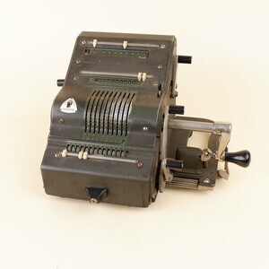 1871 wurde die Firma Grimme, Natalis & Co. (kurz: GNC) in Braunschweig gegründet. Die erste Rechenmaschine wurde im Juli 1892 unter dem Namen „Brunsviga“ für 150 Mark ausgeliefert und 1893 auf der Weltausstellung in Chicago von Deutschland ausgestellt. Bis zum Firmenjubiläum 1952 wurden insgesamt etwa 260.000 Rechenmaschinen gebaut. Aus finanziellen Gründen erfolgte 1957 die Übernahme durch die Olympia-Werke, Wilhelmshaven. Durch die Weiterentwicklung, hin zur Transistortechnik, verloren die mechanischen Maschinen schnell an Wettbewerbsfähigkeit. Die RK 13 verfügt über eine Zehnerübertragung im Umdrehungszählwerk und eine Einzellöschung der drei Zählwerke. Über einen weiteren Hebel können gleichzeitig alle Zählwerke in die Null Stellung gebracht werden. Technisch handelt es sich um eine Sprossenradmaschine mit 10 x 8 x 13 Stellen (Einstellwerk/Zählwerk/Resultatwerk). Unsere Maschine wurde als Modell RK 13 zwischen 1937 und 1945 in Braunschweig gebaut. Sie trägt die Herstellungsnummer 256 215. Das Gehäuse zeigt sich –warum auch immer-, nur noch ansatzweise in der Originallackierung. Auf der Vorderseite ist der Maschinentyp „ RK 13“ , die Produktionsnummer und der Hersteller eingestanzt. Ein aufgenietetes Metallplättchen zeigt das Firmenlogo, dass einen stilisierten Kopf, mit mehreren Zahnrädchen darin, darstellt. Leider ist unsere 13 RK durch falsche Pflege im Innern total verharzt, so dass sich alle Bedienteile nur mit deutlichem Kraftaufwand bedienen lassen. In einer Originalpreisliste aus dem Jahr 1952 steht ein Preis von 795 DM.