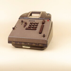 Victor Adding Machine Co., aus Chicago/USA produzierte zwischen 1918 und 1973 Aditions und Rechenmaschinen. Unser Objekt besitzt die Typenbezeichnung 73 85 54 und ist eine Variante des Typs 74-85-54. Hergestellt in der Zeit zwischen 1963 und 1971. Der Ladenpreis lag damals bei stolzen 1080 DM. An Rechenoperationen können Addition, Subtraktion und Multiplikationen durchgeführt werden. Die Zifferneingabe erfolgte über eine Zehnertastatur, die Löschung einer Zahl mittels Schiebehebel. Der Antrieb erfolgte über einen Elektromotor, der Ergebnisausdruck auf Papier(rolle) Die Victor wurde in 2 Farbvarianten verkauft. Entweder in grün/grau oder in braun, wie unser Modell. Unser Objekt war wohl in einer Schreiner Werkstatt im Einsatz, denn beim Öffnen zeigten sich große Mengen Sägespäne. An der Vorderseite ist ein Aufkleber angebracht wonach die Firma Krämer aus Landau in der Pfalz den Service durchgeführt hat.