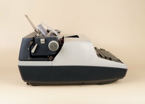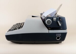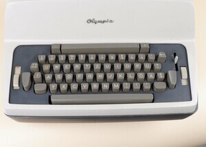 1930 erhielt die Europa Schreibmaschinen AG aus Erfurt den international geschützten Markennamen „Olympia“. Nach dem 2.Weltkrieg flohen Mitarbeiter des Erfurter Werkes samt Konstruktionsunterlagen in den Westen. In Roffhausen/Wilhelmshaven begannen sie ab 1946 wieder mit der Schreibmaschinen Produktion. Das Wilhelmshavener Werk firmierte ab 1950 „Olympia Werke West GmbH“ und ab Juni 1954 erhielt das Unternehmen seine bekannte Firma Olympia Werke AG. 1959 begann man in Roffhausen mit dem Bau von elektrischen Schreibmaschinen. Der Typ „SGE“. (S für Schreibmaschine G für groß und E für elektrisch) wurde in mehreren Varianten hergestellt. Unser Objekt stammt aus den 1970 er Jahren und hat ein grau/beiges Gehäuse. Der Wagen hat eine Walzenbreite von 33 cm. Der Motor läuft gut, jedoch reagieren die Typenhebel nicht mehr. Die Abdeckhaube ist erhalten geblieben.