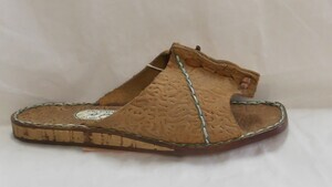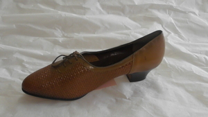 Ein Paar Herrenhalbschuhe aus braunem Kudu-Leder (eine Antilopen-Art). Runde Form, Absatz (ca. 2cm), Lochschnürung mit Lasche. Die Sohlen dieser Schuhe bestehen aus der Außenseite von Autoreifen, das Profil ist klar zu erkennen. Das Obermaterial, sowie das Innenfutter, bestehen aus einem Stück. Hergestellt in Namibia. Datiert auf 1996.