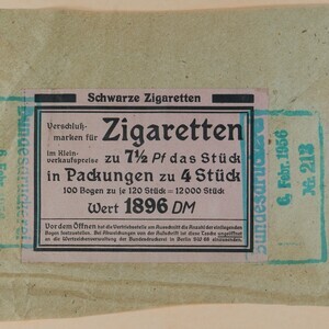 In Deutschland wurden und werden alle Arten von Tabakwaren mit der Tabaksteuer belastet. In den 1960er Jahren wurde der Absatz des in Deutschgland angebauten Tabaks durch eine verminderte Steuerabgabe gefördert. Marken wie wie Roth Händle, Maryland und Bali profitierten davon. Warum ? Sie enthielten einen hohen Anteil an Inlandstabak, dessen Absatz so gefördert werden sollte. Äußerlich an den Packungen erkennbar, an der GRÜNEN Steuerbanderole. Diese wurden in der Bundesdruckerei gedruckt und nach Bezahlung der „Banderolensteuer“ an die Hersteller ausgeliefert. In unserem Magazin ist ein Teil der Umverpackung erhalten geblieben. Versehen mit einem 10,5 cm x 7,5 cm großen Ettikett mit der Aufschrift "Verschlussmarke für Zigaretten zum Kleinverkaufspreis zu 7,5 Pg. das Stück in Packungen zu 4 Stück. 100 Bogen zu je 120 Stück = 12.000 Banderolen. WERT 18969 DM" Rechts und Links wurde das Ettikett mit dem Stempel der Bundesdruckerei versiegelt. Er trägt die Aufschrift "Bundesdruckerei 6. Febr. 1956 - Nr. 213"