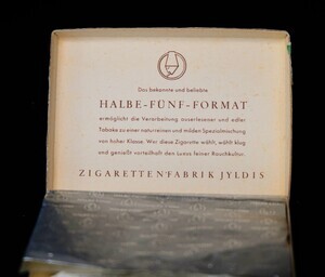Um 1920 wurde unter dem Namen "Jyldis, Türkische Tabak- u. Cigarettenfabrik" das Unternehmen gegründet. (yildiz (Türkisch) bedeutet "Stern“). Produziert wurden 2 Marken: Lasso und Halbe fünf. Von 1948 bis 1953 bestimmte die „Saarländische Tabakregie“ das Geschehen im Saarland. Aus dieser Zeit stammt unser Objekt. Einer 20er Packung Halbe Fünf, rundes Format und ohne Mundstück. Die gelbe Pappschachtel trägt auf der Mitte des Deckels ein rundes Signet –eine halbierte 5 Pfennig Münze. Beschriftet ist der Deckel mit „Jyldis Zigaretten, Die runde Halbe Fünf, Naturreine Spezialmischung.“ Die grüne Steuerbanderole trägt lediglich die Information „Saarländische Tabakregie – 20 Zigaretten“. Die Packung ist noch weitgehend mit Zigaretten gefüllt. Jede Einzelne trägt die Aufschrift Halbe Fünf in Kursiv Schrift