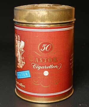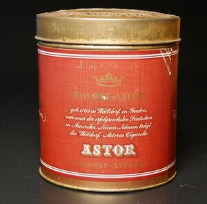Die Zigarettenmarke ASTOR war ursprünglich Eigentum der Waldorf-Astoria Zigarettenfabrik. Sie war ein deutsches Unternehmen , das von 1906 bis 1929 bestand. Namensgeber war das weltbekannten New Yorker Hotel „Waldorf Astoria“ dessen Gründer aus Waldorf (früher Kurpfalz) stammte. In der zweiten Hälfte der 1920er Jahre geriet das Unternehmen in Schwierigkeiten und wurde 1929 durch den Reemtsma-Konzern übernommen. Auf der Packung ist das Portrait von Johann Jakob Astor abgebildet. 1950 kam die Exklusivmarke ASTOR auf den Markt. Zunächst ohne Filter, ab 1955 als Filterzigarette. Der Siegeszug der Filterzigarette hatte in kürzester Zeit bereits einen Anteil von 25 Prozent aller Zigaretten erreicht. 1958 wurden von der ASTOR ca. 211 Millionen Zigaretten hergestellt Unser Objekt ist eine ASTOR Geschenkpackung aus den 1960er Jahren. Verpackt waren, in der ovalen Blechdose, 50 Stück Filterzigaretten zu einem Kleinverkaufspreis von 10 Pfennig/Stück bzw. 5,00 DM pro 50er Packung. Weitere Packungsgrößen waren eine 10er und 20er Packungen jeweils als Hartbox.