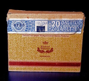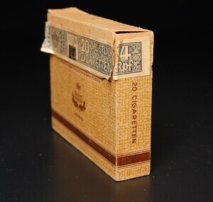 Die Zigarettenmarke ASTOR war ursprünglich Eigentum der Waldorf-Astoria Zigarettenfabrik. Sie war ein deutsches Unternehmen , das von 1906 bis 1929 bestand. Namensgeber war das weltbekannten New Yorker Hotel „Waldorf Astoria“ dessen Gründer aus Waldorf (früher Kurpfalz) stammte. In der zweiten Hälfte der 1920er Jahre geriet das Unternehmen in Schwierigkeiten und wurde 1929 durch den Reemtsma-Konzern übernommen. Unser Objekt ist eine braune 20er Schiebeschachtel für 20 Zigaretten. Auf der Vorderseite ist auf der linken, oberen Hälfte eingedruckt: „20 Cigaretten Echt Orient No. 5“ im unteren Bereich ist der Name „Waldorf Astoria“ abgedruckt, eingerahmt vom Firmenlogo, einer Krone mit Eichenlaub. Rückseitig fällt die Steuerbanderole ins Auge, mit dem Aufdruck 20 Zigaretten, das Stück 4 Rpf. Daneben der Reichsadler, wobei das Hakenkreuz überstempelt wurde. Das lässt die Vermutung zu, dass die Packung unmittelbar nach Kriegsende produziert wurde. Auffällig auch die Namensänderung auf der Zigarette selbst. Ursprünglich gestempelt mit „Waldorf Astoria No. 5“ hieß sie nun „Sondermischung TYP 4 Pfg“ Besonders Interessant: Unterhalb der Banderole finden wir einen Aufdruck: „Verkauf nur gegen Rückgabe einer leeren Packung“. Die Packung ist heute noch zur Hälfte gefüllt. Die Zigaretten haben ein rundes Format, eine reine Orientmischung und sind ohne Filter.