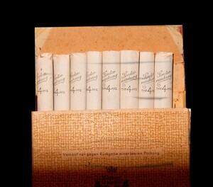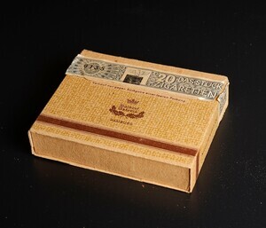 Die Zigarettenmarke ASTOR war ursprünglich Eigentum der Waldorf-Astoria Zigarettenfabrik. Sie war ein deutsches Unternehmen , das von 1906 bis 1929 bestand. Namensgeber war das weltbekannten New Yorker Hotel „Waldorf Astoria“ dessen Gründer aus Waldorf (früher Kurpfalz) stammte. In der zweiten Hälfte der 1920er Jahre geriet das Unternehmen in Schwierigkeiten und wurde 1929 durch den Reemtsma-Konzern übernommen. Unser Objekt ist eine braune 20er Schiebeschachtel für 20 Zigaretten. Auf der Vorderseite ist auf der linken, oberen Hälfte eingedruckt: „20 Cigaretten Echt Orient No. 5“ im unteren Bereich ist der Name „Waldorf Astoria“ abgedruckt, eingerahmt vom Firmenlogo, einer Krone mit Eichenlaub. Rückseitig fällt die Steuerbanderole ins Auge, mit dem Aufdruck 20 Zigaretten, das Stück 4 Rpf. Daneben der Reichsadler, wobei das Hakenkreuz überstempelt wurde. Das lässt die Vermutung zu, dass die Packung unmittelbar nach Kriegsende produziert wurde. Auffällig auch die Namensänderung auf der Zigarette selbst. Ursprünglich gestempelt mit „Waldorf Astoria No. 5“ hieß sie nun „Sondermischung TYP 4 Pfg“ Besonders Interessant: Unterhalb der Banderole finden wir einen Aufdruck: „Verkauf nur gegen Rückgabe einer leeren Packung“. Die Packung ist heute noch zur Hälfte gefüllt. Die Zigaretten haben ein rundes Format, eine reine Orientmischung und sind ohne Filter.