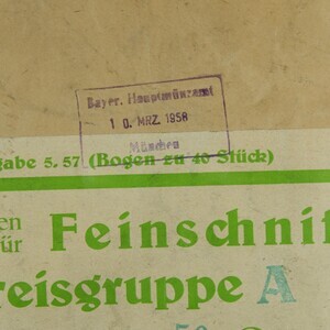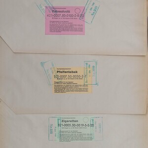 Bereits 1906 führten die Preußen im Deutschen Reich die bis heute übliche „Banderolensteuer“ ein, die auf jeder Packung, in Form eines Steuerzeichens (Banderole), erkennbar ist. Die Banderolen selbst, werden in der Bundesdruckerei gedruckt und nach Bezahlung der „Banderolensteuer“ an die Hersteller ausgeliefert. In unserem Magazin sind Teile, von deren Umverpackung mit Aufklebern, erhalten geblieben. Aus dem Jahr 1958 sind es –so der Aufkleber- „Steuerzeichen für Feinschnitt Preisgruppe A in Packungen zu 50 gr. 100 Bögen zu je 40 Stück = 4000 Stück (Banderolen) WERT 1050 DM“ Der Aufkleber wurde mit einem Stempel versiegelt: „Bayrisches Hauptzollamt 10. März 1958 München.