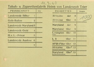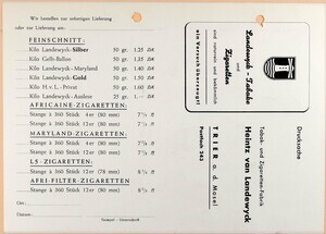 Preisliste/Bestellkarte - Firma Landewyk, Trier Zigaretten & Feinschnitt