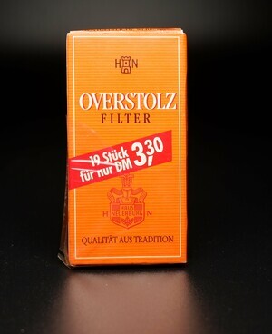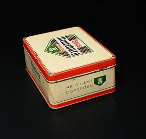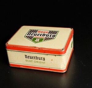 Die Brüder H&A Neuerburg gründeten 1908 eine der ersten Zigarettenfabriken in Trier. Mit hochwertigen Marken wie Overstolz, Löwenbrück, Güldenring und Mercedes entwickelte sich das Familienunternehmen bald zu einem der bekanntesten Tabakhersteller Deutschlands. Ein harter Konkurrenzkampf führte 1935 zum Verkauf des Hauses Neuerburg an den Zigarettenhersteller „Reemtsma“ in Hamburg. Ab 1960 erwarb die Firma Reynolds Tobacco Company alle Geschäftsanteile. Reynolds wiederum wurde 1999 komplett von Japan Tobacco Inc (JTI) in Trier übernommen. Unser Objekt ist eine Blechdose für 48 „Haus Neuerburg Zigaretten“ aus den späten 1950er Jahren. Die Packung ist in einem helle beige gehalten. Im Deckel-und Bodenbereich ist sie mit einem rundumlaufenden 5mm breiten, orangen Rand versehen. Auf dem Deckel prangt das Logo „Neuerburg“ mit Wappen. Die Deckel Innenseite ist ebenfalls bedruckt mit „Haus Neuerburg Zigaretten“ in grün auf goldenem Grund. Seitlich findet sich noch die Inhaltsangabe „48 Orient Zigaretten“
