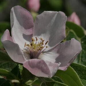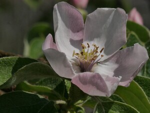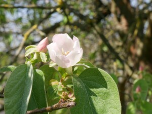 Quitten werden als Obstbäume seit 4000 Jahren kultiviert. Die ursprüngliche Heimat liegt im östlichen Kaukasus und im Transkaukasus. Die Hauptanbaugebiete liegen in Usbekistan, der Türkei, China und dem Iran. Quitten sind sommergrüne, dornenlose Bäume oder Sträucher. In Kultur wurden sie oft auf Weißdorn (Crataegus) gepfropft (heute allerdings bevorzugt auf speziell geeignete Quittenunterlagen), während sie ihrerseits gerne als Unterlage für Birnen (Pyrus) genommen werden, deren Früchte dadurch früher reifen und besonders aromatisch werden. Pflanzdatum unbekannt. Ziemlich großer Baum der nur von Norden her von einer Esskastanie bedrängt wird.