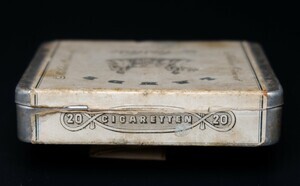 Das Unternehmen LANDE, Zigaretten- und Tabakfabrik (Kasaky) wurde 1897 gegründet und 1913 nach Dresden verlagert. Nach der Zwangsverkauf, durch die Nazi, wurde die Firma von Karl Geissinger übernommen, an der sich Reemtsma 1938 zur Hälfte beteiligte. Nach dem Krieg wurde der Betrieb in den VEB - Zigarettenfabriken Dresden eingegliedert. Unser Objekt ist eine Blechpackung für 20 Orient Cigaretten, im „Herrrenformat“ Die Packung ist mit einem rundum laufenden Papier beklebt, das als Druckunterlage genutzt wurde. Unterhalb des Namens LANDE ist eine Abbildung, die zwei Orientalisch gekleidete Männer, neben einem Tabakballen, stehend, zeigt. Da die Packung ursprünglich, in den 1930er Jahren, als Reliefdose ausgeliefert wurde, scheint unsere Packung in Zeiten der Materialknappheit, entweder gegen Ende oder direkt nach dem Krieg, hergestellt worden zu sein.