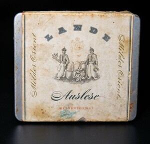Das Unternehmen LANDE, Zigaretten- und Tabakfabrik (Kasaky) wurde 1897 gegründet und 1913 nach Dresden verlagert. Nach der Zwangsverkauf, durch die Nazi, wurde die Firma von Karl Geissinger übernommen, an der sich Reemtsma 1938 zur Hälfte beteiligte. Nach dem Krieg wurde der Betrieb in den VEB - Zigarettenfabriken Dresden eingegliedert. Unser Objekt ist eine Blechpackung für 20 Orient Cigaretten, im „Herrrenformat“ Die Packung ist mit einem rundum laufenden Papier beklebt, das als Druckunterlage genutzt wurde. Unterhalb des Namens LANDE ist eine Abbildung, die zwei Orientalisch gekleidete Männer, neben einem Tabakballen, stehend, zeigt. Da die Packung ursprünglich, in den 1930er Jahren, als Reliefdose ausgeliefert wurde, scheint unsere Packung in Zeiten der Materialknappheit, entweder gegen Ende oder direkt nach dem Krieg, hergestellt worden zu sein.